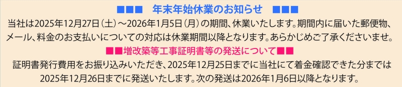 当社にて着金確認できた日の翌営業日までに、増改築等工事証明書を、メールまたは郵送で発行いたします。 「料金表と必要書類」のPDFを見る (年末12月25日以降に届いたご依頼や書類は、翌年1月10日以降に確認いたします) (12月20~12月25日に依頼書類到着分は、証明書発行が翌年になる場合があります) |