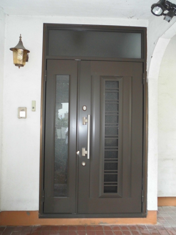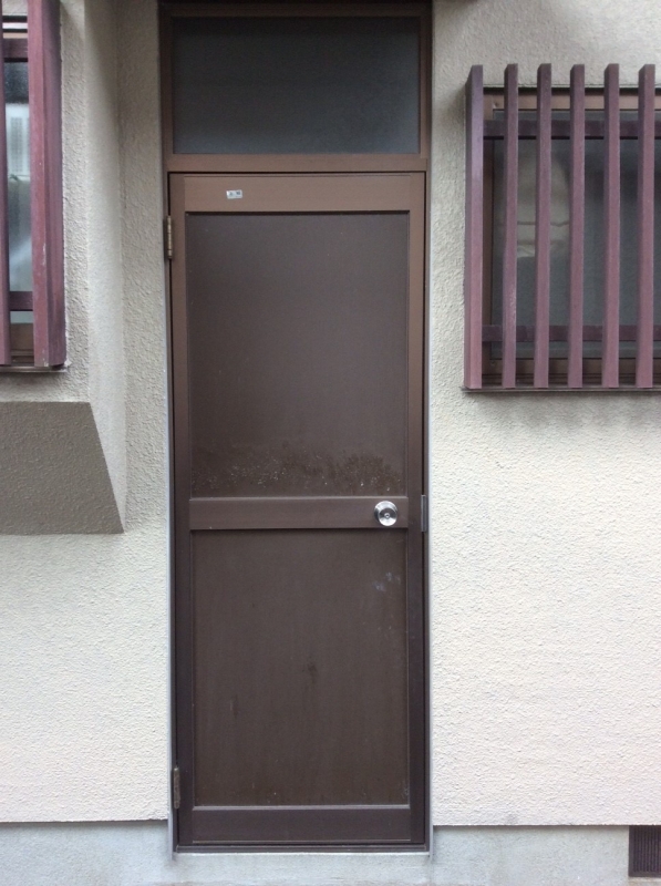 ▲木質のドアは、古くなってくると塗装がはげたり、開きにくくなったりします。シックな色合いのアルミドアに交換です。