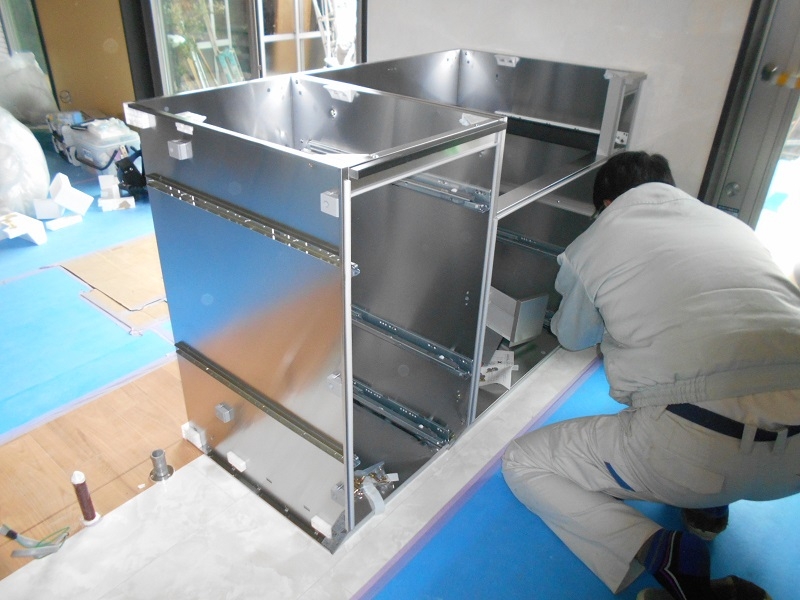 まずはLDKのシステムキッチン組み立ての様子です。