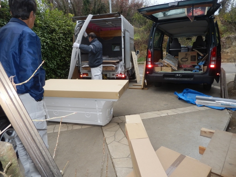 ▼解体の翌朝、システムバスの材料が運ばれてきました。