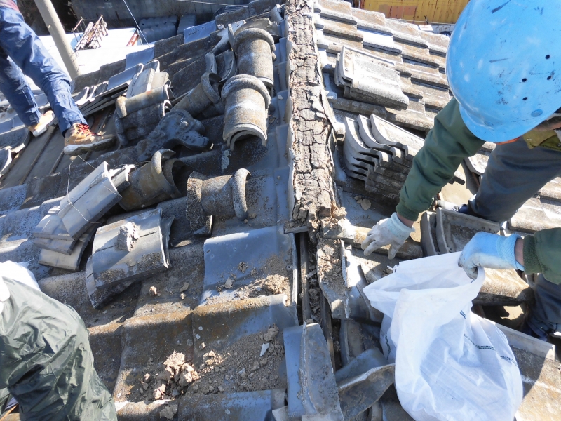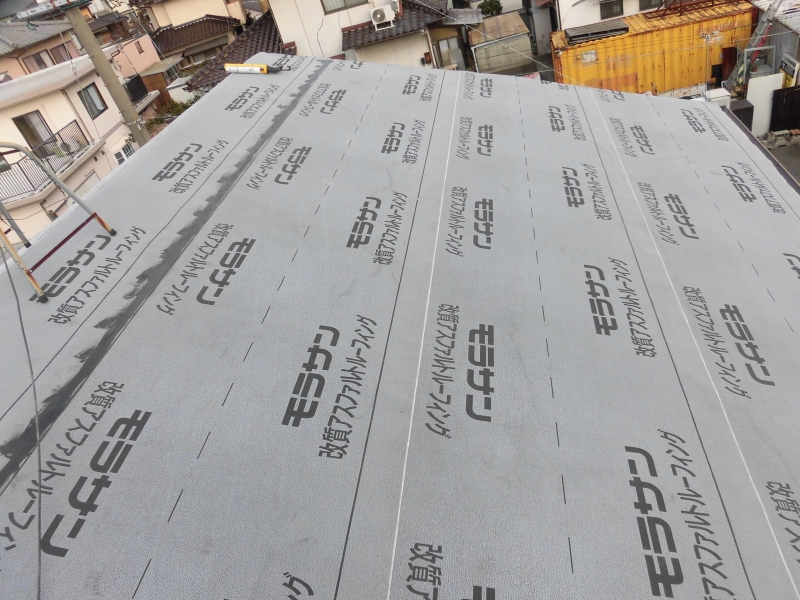 ▼瓦を撤去したあと。古いルーフィングが見えています。