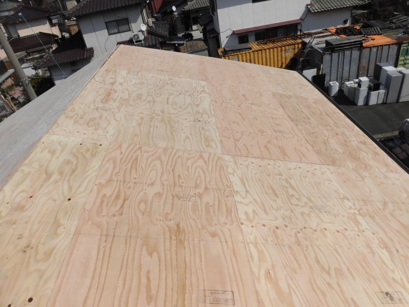 ▲垂木の上に耐水合板を乗せ、その上に▼新しくアスファルトルーフィングを敷き詰めます。