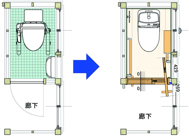 また、今のトイレは出入口の幅も狭いですね。扉の取付方法を変えて、なるべく入口を広く取れるようにしましょう。