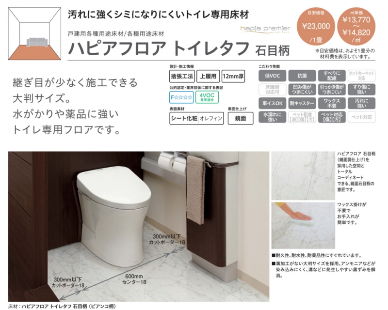 色柄も豊富で、目地が少ないから尿漏れなどあっても目地内部にしみこむことなく、トイレ特有の酸っぱいニオイが発生しにくいんですよ。