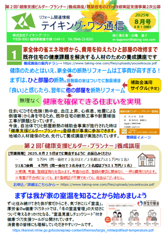 案内:https://www.taking-one.com/files/uploads/youseikouza.pdf募集団体:(一社 )日本住宅リフォーム産業協会(通称ジェルコ)